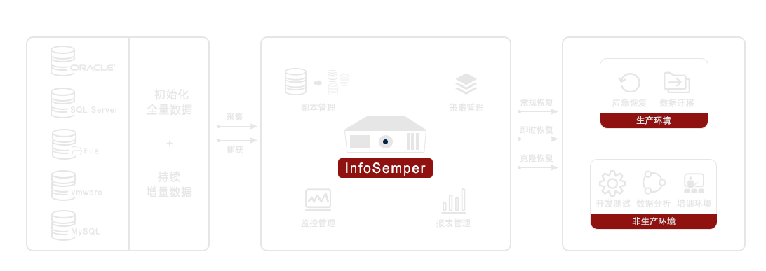 基于應(yīng)用系統(tǒng)的標(biāo)準(zhǔn)化接口捕獲生產(chǎn)環(huán)境中的文件、數(shù)據(jù)庫(kù)、虛擬機(jī)等數(shù)據(jù),基于快照技術(shù)建立多副本管理體系,