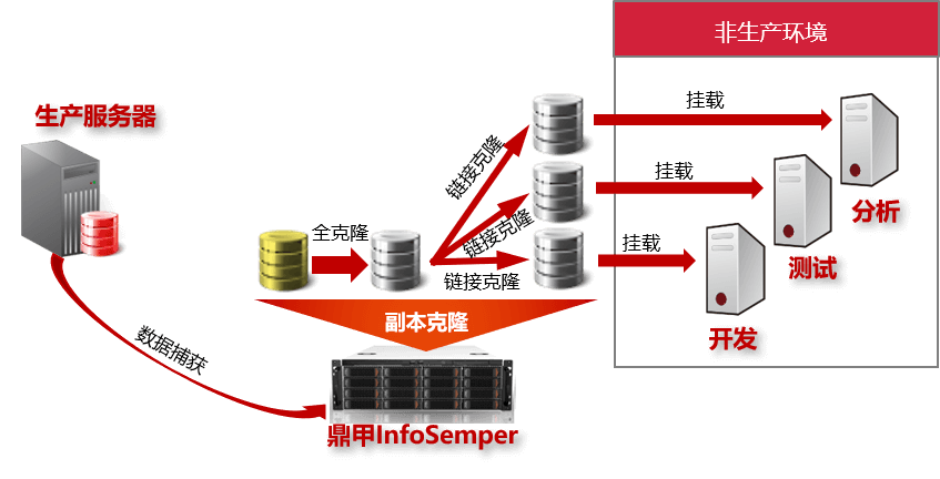 通過副本掛載實(shí)現(xiàn)數(shù)據(jù)的即時(shí)恢復(fù),既可以支持生產(chǎn)環(huán)境的應(yīng)急與演練,又可以支持非生產(chǎn)環(huán)境的開發(fā)、測(cè)試、數(shù)據(jù)分析等應(yīng)用場(chǎng)景