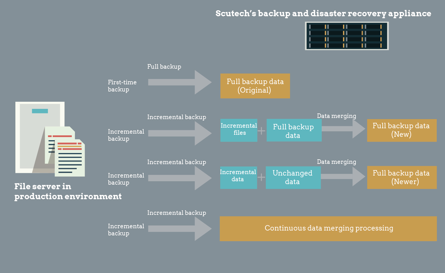 Scutech isolates file indexing and data backup into two separate processes: while the system is traversing through file directories, on one hand it creates an index for files and backs up files at the same time, which greatly shortens backup window and improves efficiency.